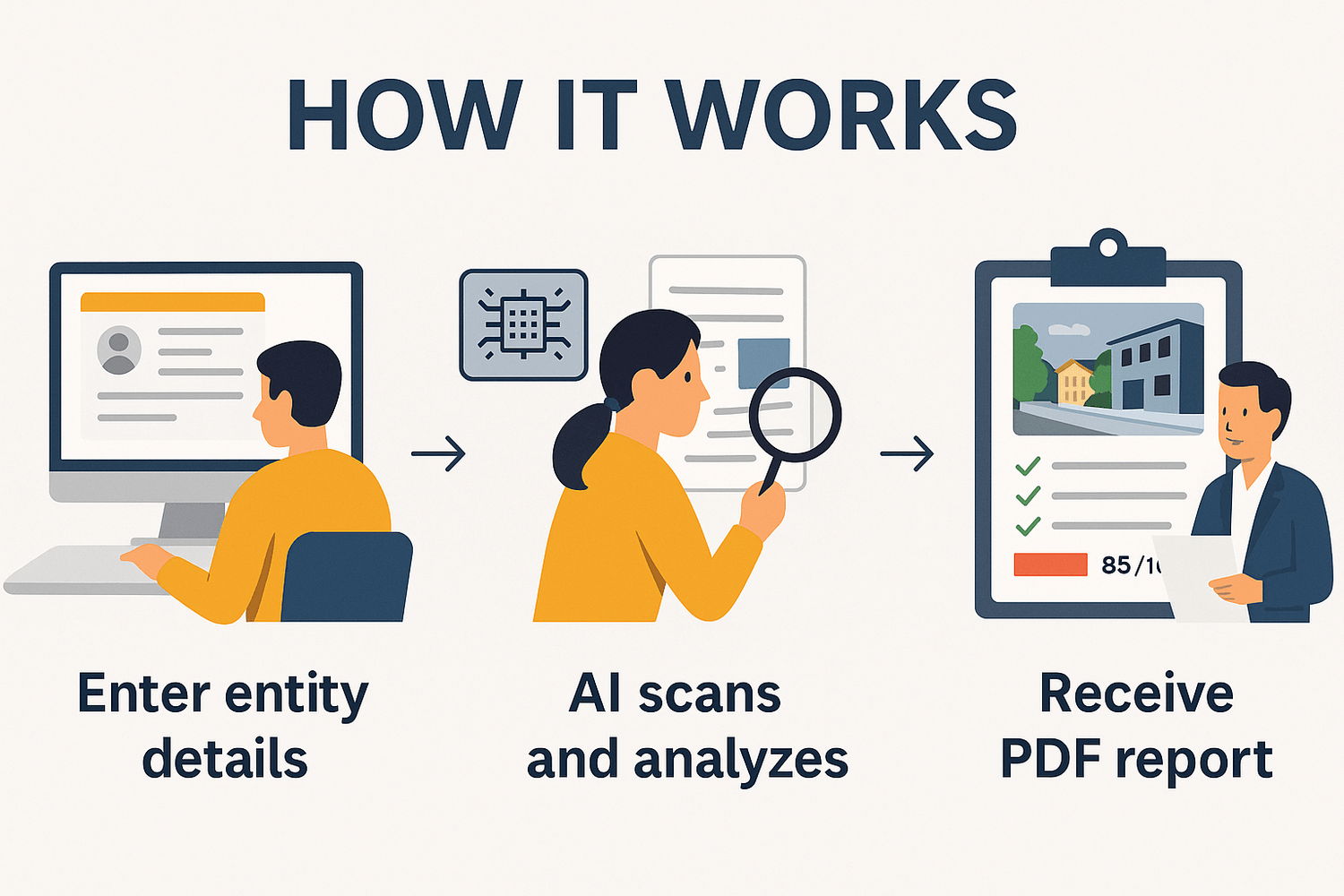 Reports are powered by AI and cross-verified through multiple trusted data sources, including company registries, IP reputation databases, and DNS validation tools. Each report is designed to highlight both verified “green flags” and potential “red flags” for a balanced assessment.