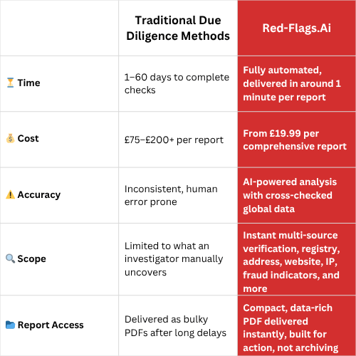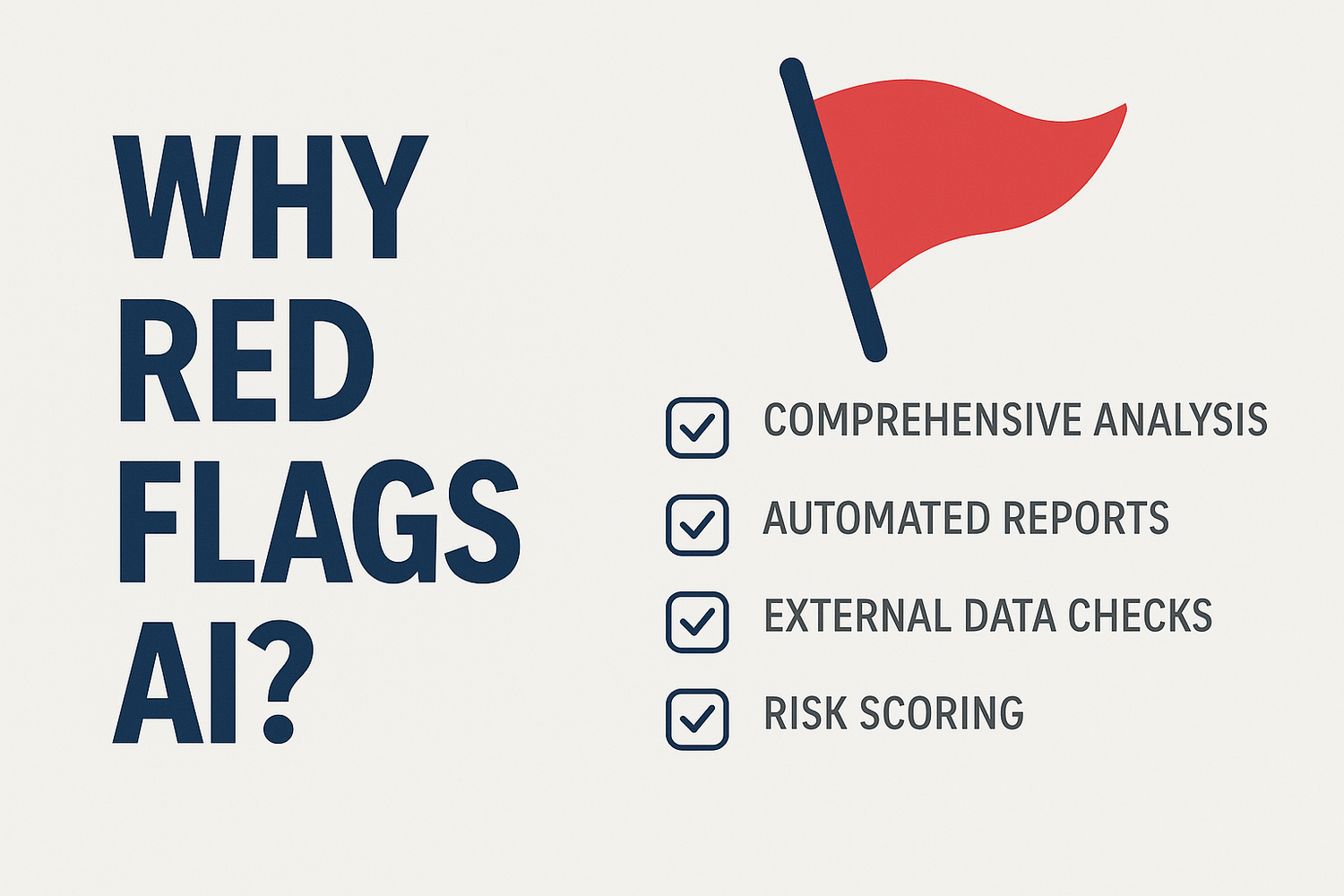 Red Flags Ai helps businesses protect their deals with fast, reliable due diligence. Our AI-powered reports flag risks in minutes, giving you the confidence to trade smarter and safer.